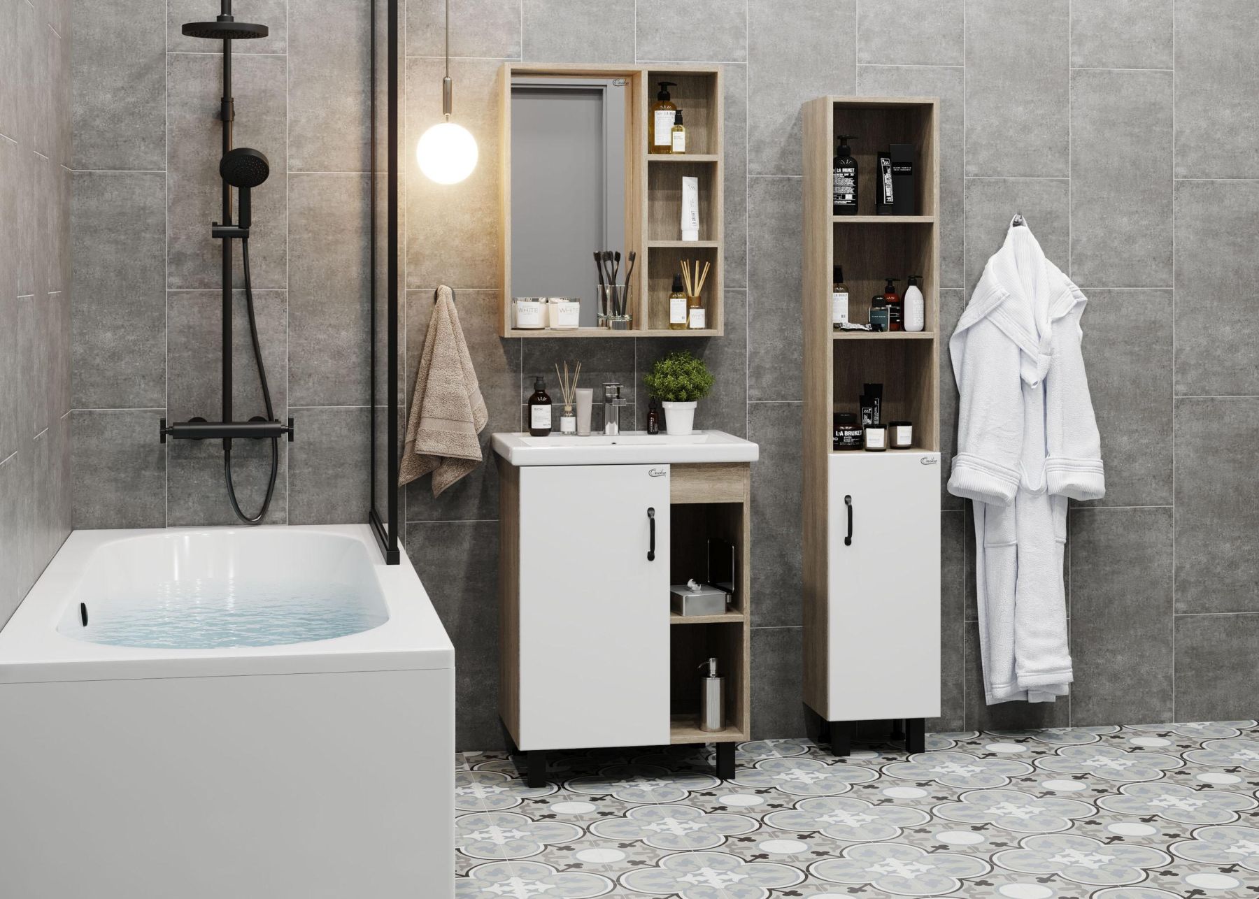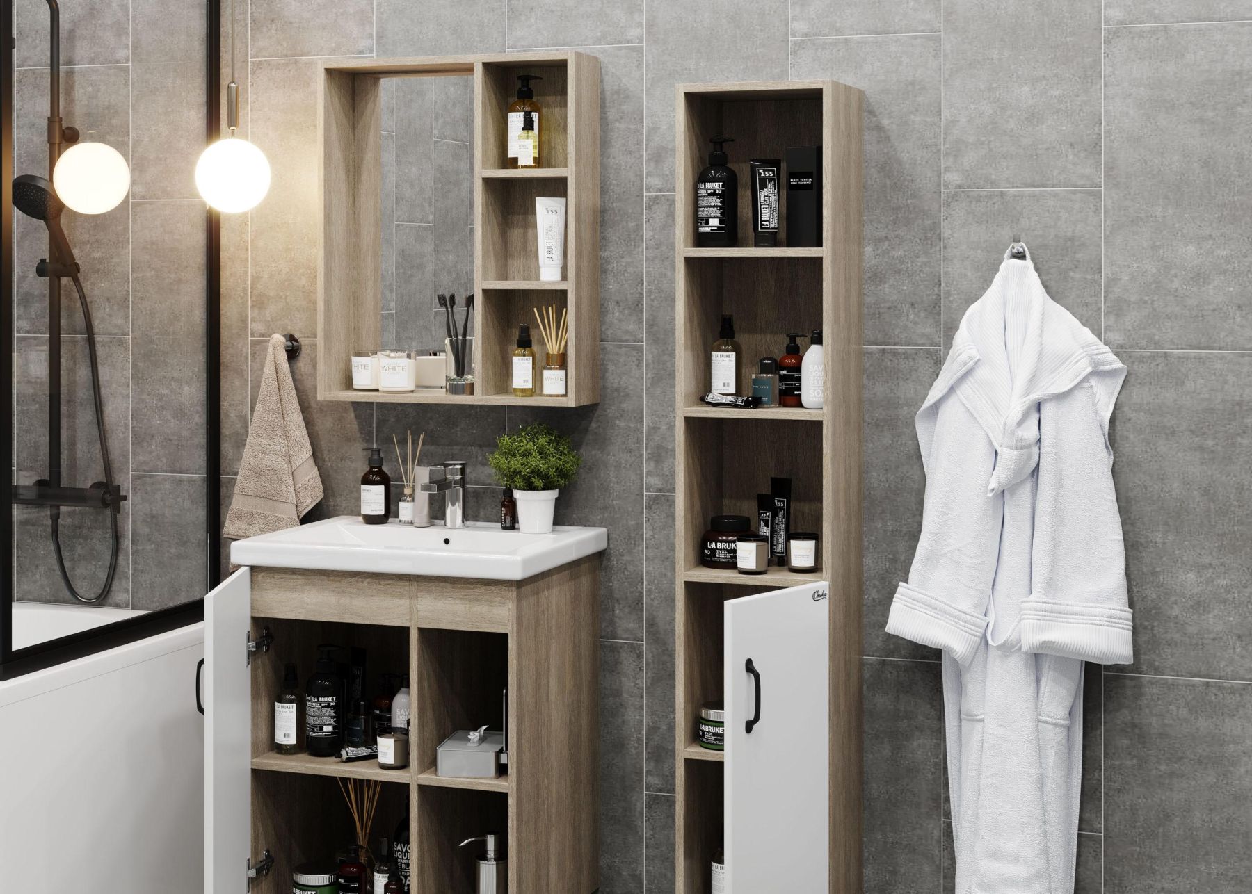 Открытые полки справа обеспечивают быстрый доступ к часто используемым аксессуарам, а пространство за распашной дверцей слева, снабженной системой плавного закрывания, станет удобным местом для хранения различных бытовых принадлежностей.