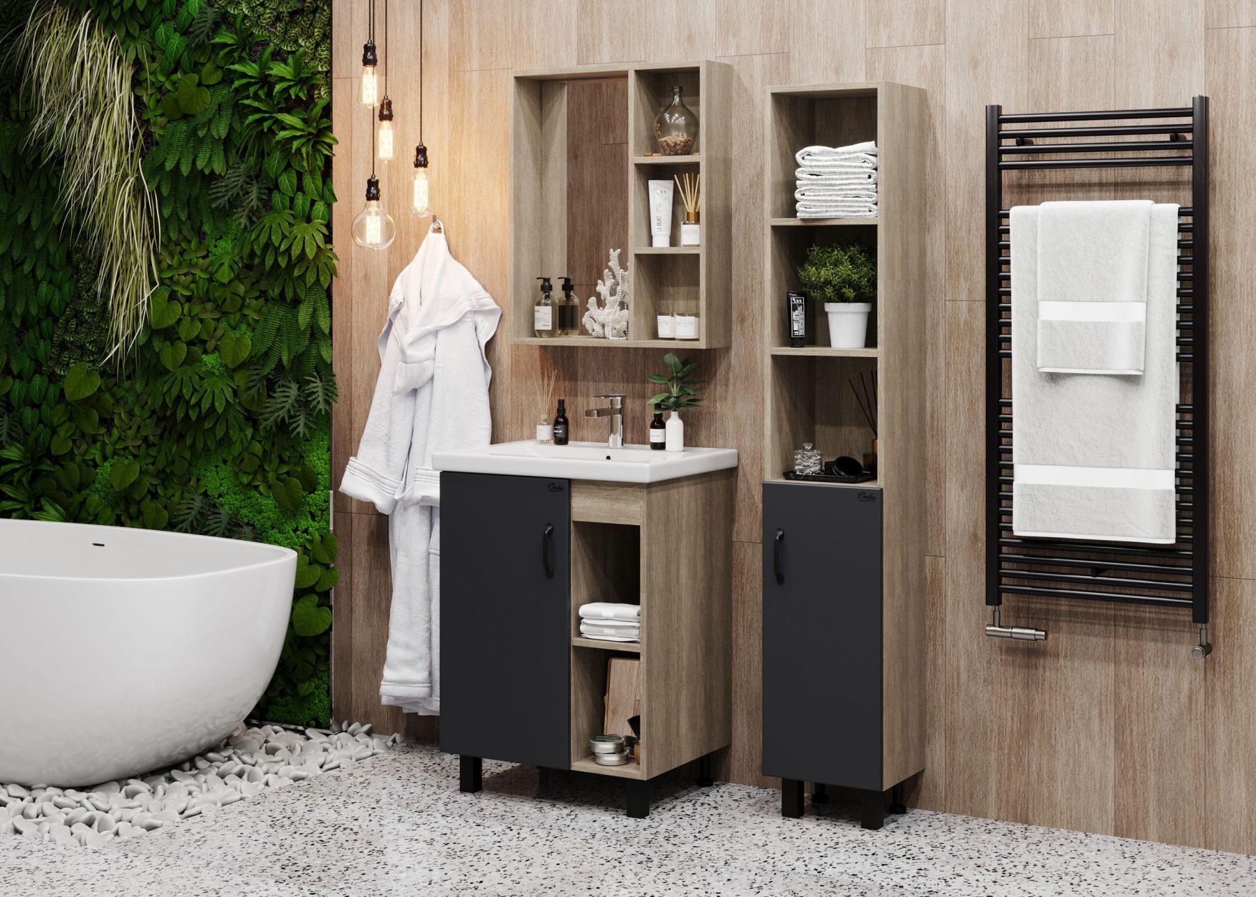 В тумбе Onika Тимбер 60 удачно сочетаются контрастные цвета и фактуры: серый матовый фасад с покрытием SoftTouch, корпус цвета дуба с роскошной текстурой, черная матовая металлическая фурнитура.