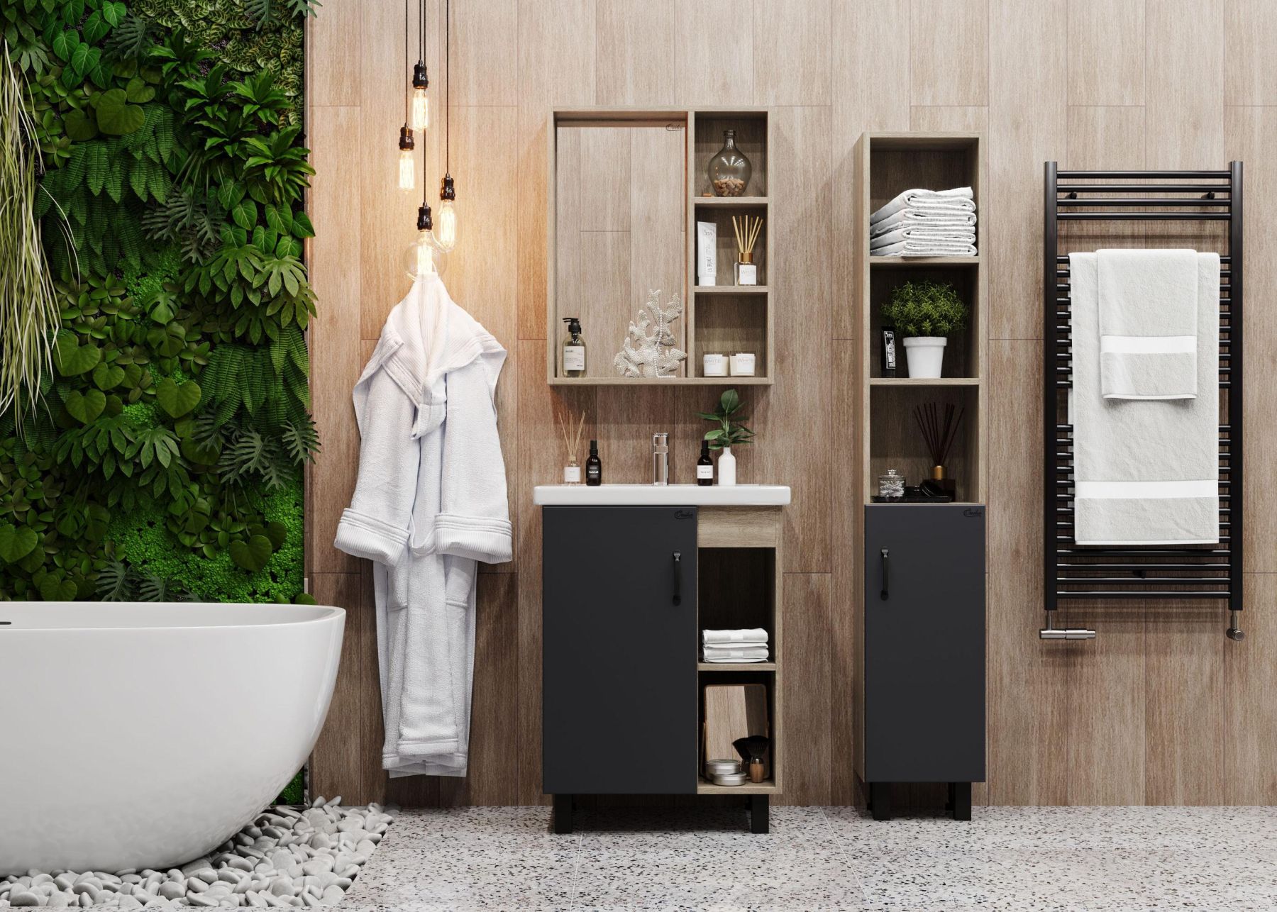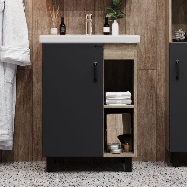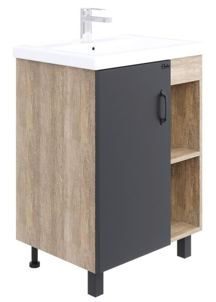 В тумбе Onika Тимбер 60 удачно сочетаются контрастные цвета и фактуры: серый матовый фасад с покрытием SoftTouch, корпус цвета дуба с роскошной текстурой, черная матовая металлическая фурнитура.
