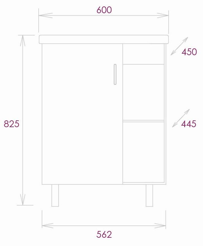Размеры тумбы без учета раковины и ножек 56x44x68 cм.