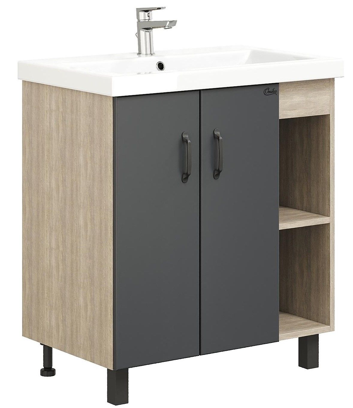 В тумбе Onika Тимбер 80 удачно сочетаются контрастные цвета и фактуры: серый матовый фасад с покрытием SoftTouch, корпус цвета дуба с роскошной текстурой, черная матовая металлическая фурнитура.