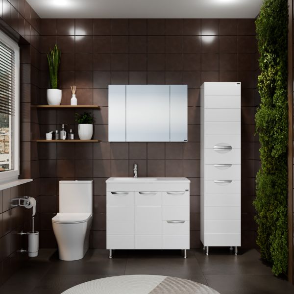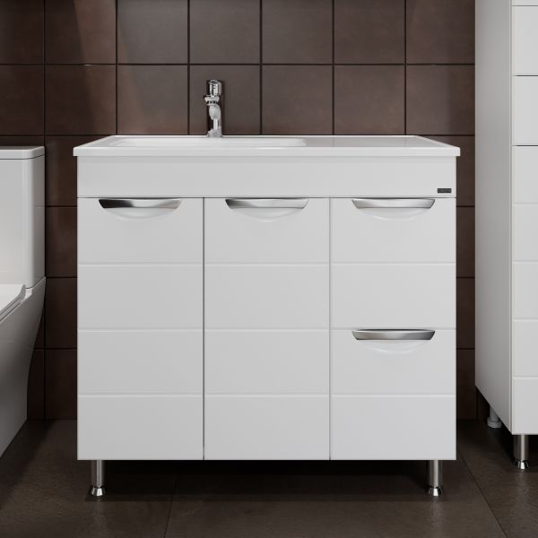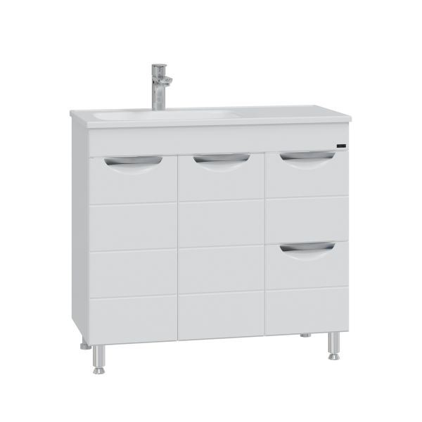 О коллекции: Коллекция Родос - современная и стильная мебель по приемлемой цене. Фасадные и боковые стенки мебели выполнены из МДФ покрытого ПВХ плёнкой. Тумба напольная "Родос 90" для умывальника "Венера 90". Тумба имеет оптимальную организацию внутреннего пространства. Комплектуется современной прямоугольной раковиной из литьевого мрамора с удобным крылом.