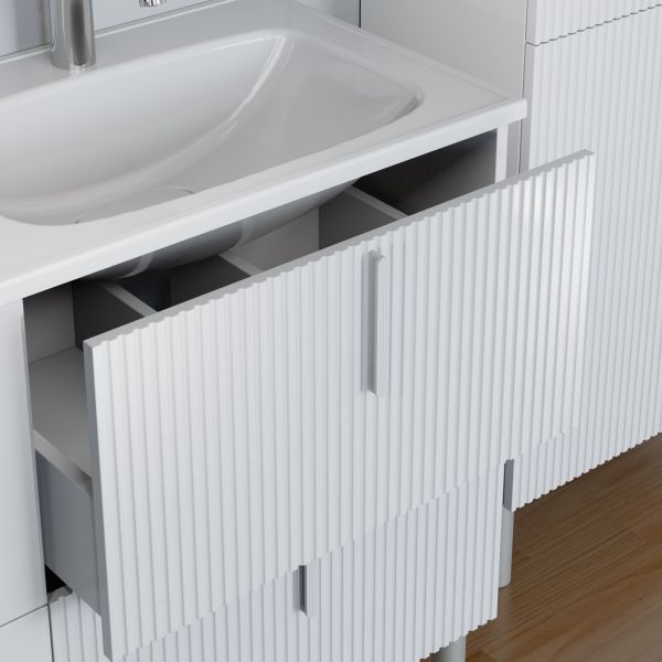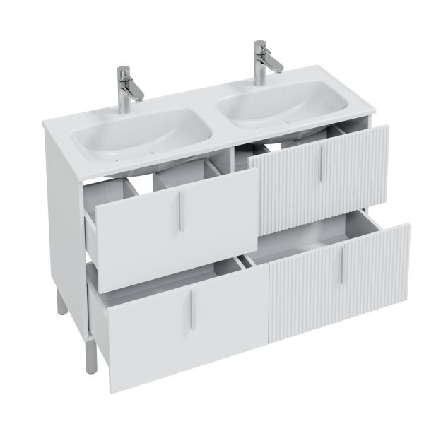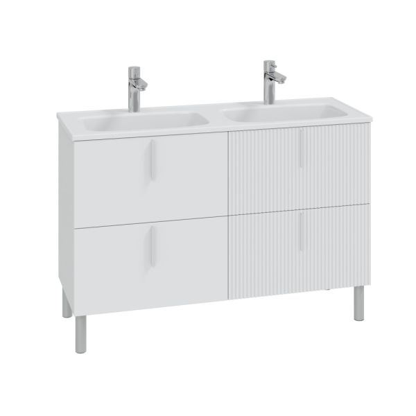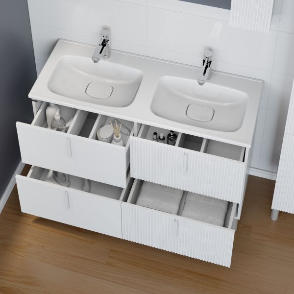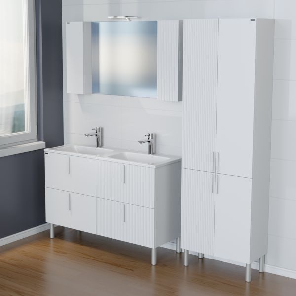 Тумба Санта Вега 120 — это современное решение для вашей ванной комнаты. Фасады и боковины выполнены из МДФ и покрыты глянцевой эмалью, ящики оборудованы доводчиками нижнего монтажа. Ящики отличаются стильным дизайном - два ящика имеют гладкий глянцевый фасад, а два выполнены с вертикальной реечной фрезеровкой. В комплекте с тумбой идут четыре стильные ручки и пять высоких ножек, которые обеспечивают надёжность и устойчивость всей конструкции. К тумбе Вега 120 подходит умывальник Санта Венера 120 с двойной чашей, выполненный из литьевого мрамора. Тумба под умывальник Вега 120 — это изысканное и практичное решение для вашей ванной комнаты. Она не только украсит интерьер, но и обеспечит все необходимое для хранения.