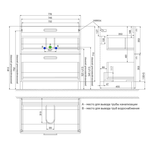 Два выдвижных ящика закрываются плавно и бесшумно благодаря высококачественным скрытым направляющим с доводчиками немецкого производства.