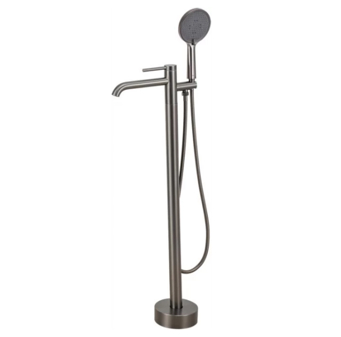 Напольный смеситель для ванной комнаты с душевой лейкой Gappo G3006-3 оружейная сталь, графит из латуни с гарантией 5 лет. Смеситель для ванны напольный с ручной лейкой латунный. Смеситель для ванной комнаты напольный, с напольный монтажом. Трубы к напольному типу смесителя подводятся из-под пола, так что перед его установкой нужно убедиться, что вы сможете позволить подпольную прокладку трубопроводов в своей ванной комнате. Материал корпуса - латунь. У данных смесителей переключение подачи воды на душевой шланг или излив происходит с помощью поворота рычага, который выносится на переднюю панель.