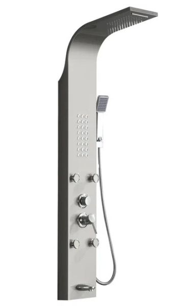 • Комплектация: душевая панель, душевая лейка, смеситель, шланг для душа, верхний душ, крепеж, инструкция
