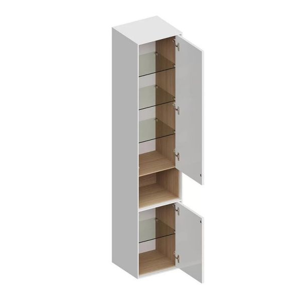 Высокий подвесной пенал в белом глянцевом цвете из МДФ c двумя дверцами и одной открытой полкой в цвете «дуб Виченца». Фасады оснащены скрытой системой открывания Push-to-open. Внутри установлено несколько стеклянных полок с возможностью регулировки по высоте. Петли для крепления дверец расположены справа. Изделия из ДСП, МДФ, а также изделия из металла требуют правильного ухода и эксплуатации. При установке и дальнейшей эксплуатации изделий, следует обратить внимание на их расположение в ванной комнате: они должны быть установлены вдали от источников тепла; температура воздуха в помещении должна быть в пределах +2 — +25 °С, а влажность воздуха не должна превышать 45%-70%. Во избежание появления пятен, отслоения облицовки и коррозии металла, не допускать скопления воды и жидкостей на поверхностях изделий и как можно скорее протереть сухой мягкой тканью участок, контактирующий с жидкостью. Соблюдайте правила ухода за изделиями из металла и они прослужат Вам очень долго.