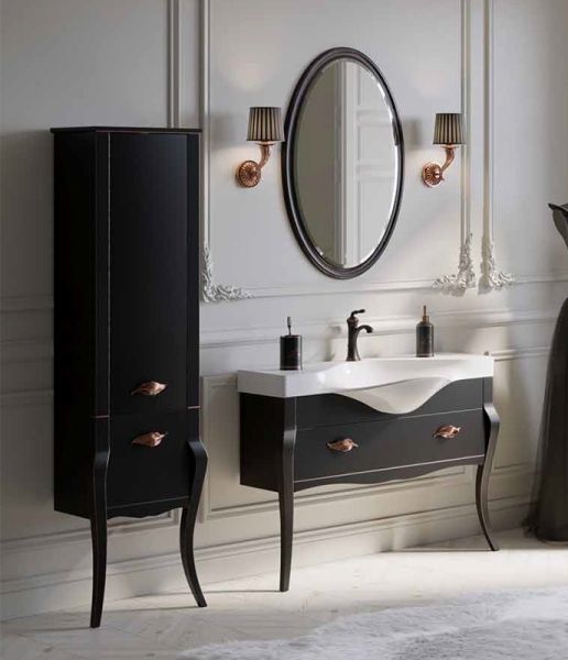 Шкаф пенал Clarberg Borgia 48 BOR0548BLK с одной распашной дверцей, выполненный в духе современной классики, отличается утонченными и изящными формами, которые подчеркивает патина под медь. Ручки в виде листьев эффектно дополняют образ мебели.Технические данные:Цвет: черный, патина медь.
