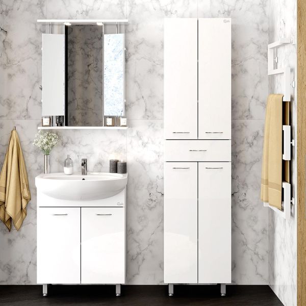 Напольный пенал для ванной комнаты с корзиной для белья Onika МОДЕРН 46, благодаря простому минималистичному дизайну, белому глянцевому фасаду, подойдет под любой интерьер ванной комнаты.