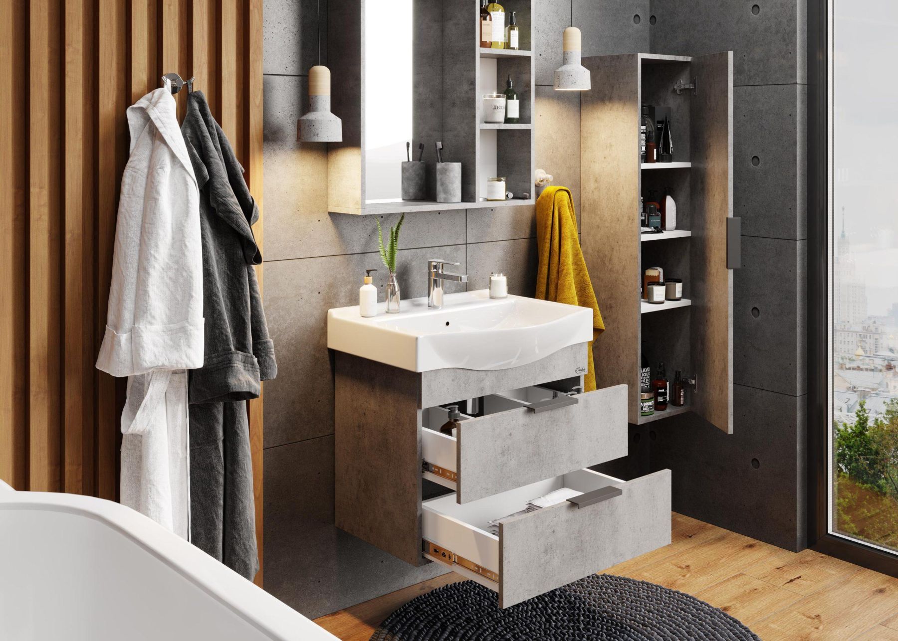 Подвесной шкаф пенал для ванной комнаты Onika ДЕВИС 30 отличается чёткой геометрией форм и создан для тех, кто ценит современный лаконичный дизайн, холодный брутальный эффект бетона чикаго, а также безупречное исполнение.