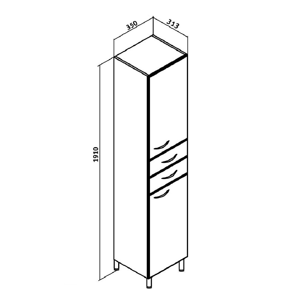 Шкаф-колонна напольный с двумя распашными дверками и выдвижными ящиками. В нижнем и верхнем отделениях - по одной внутренней полке. Ящики - на шариковых направляющих. Петли со встроенным доводчиком, ручки - 4 шт, ножки хром - 2 шт, ножки пластик -2шт.