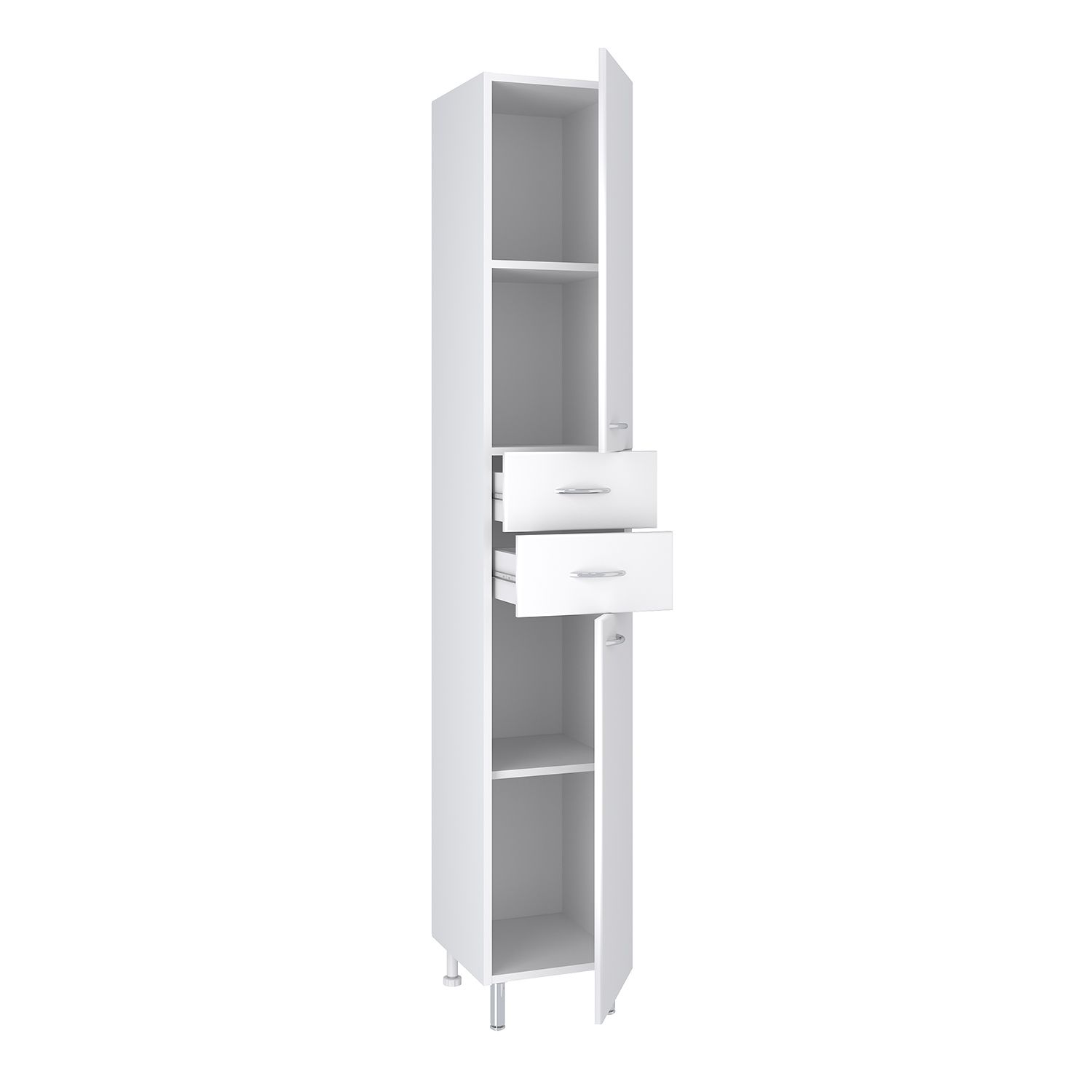 Шкаф-колонна напольный с двумя распашными дверками и выдвижными ящиками. В нижнем и верхнем отделениях - по одной внутренней полке. Ящики - на шариковых направляющих. Петли со встроенным доводчиком, ручки - 4 шт, ножки хром - 2 шт, ножки пластик -2шт.