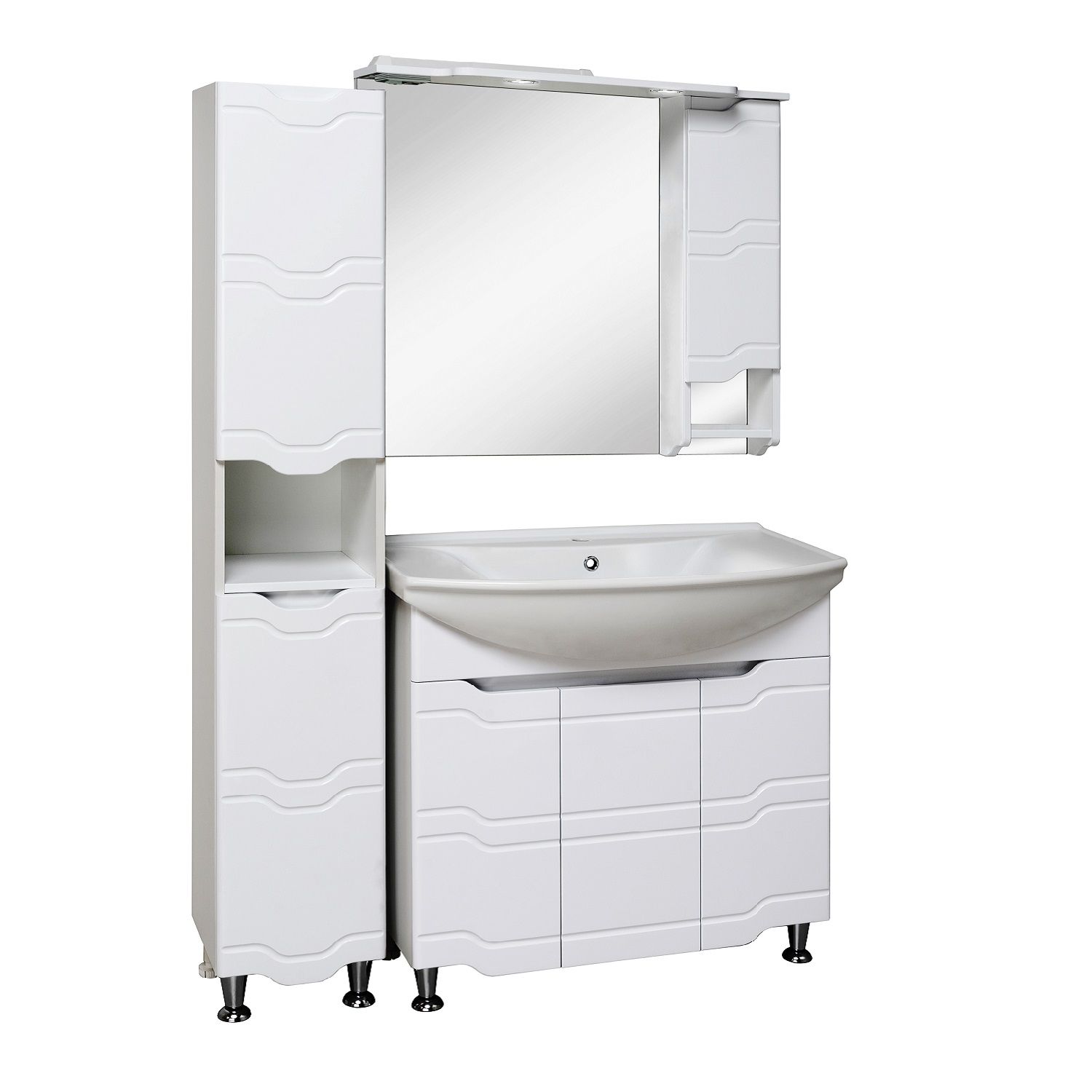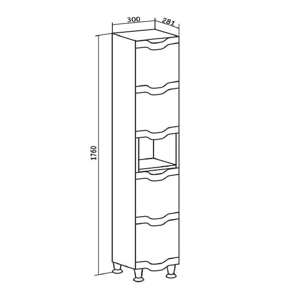 Шкаф-колонна напольный с двумя распашными дверками и открытой нишей посередине. В верхнем отделении - одна внутренняя полка, нижнее отделение комплектуется полкой и корзиной для белья. Петли со встроенным доводчиком, ножки хром - 2шт, ножки пластик -2шт. Выпускается только в правом исполнении.