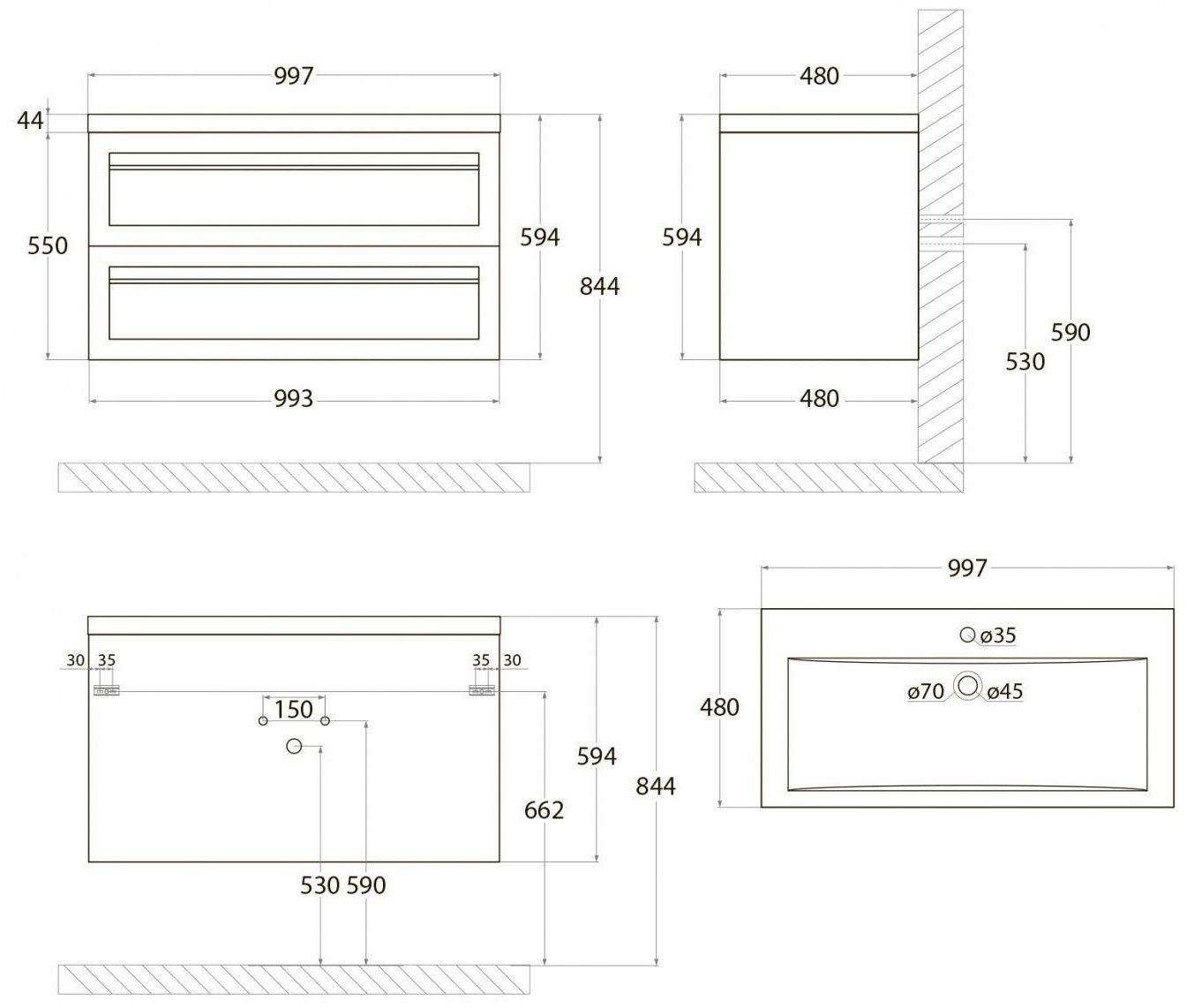 - Рекомендуемая высота от пола: 844 мм