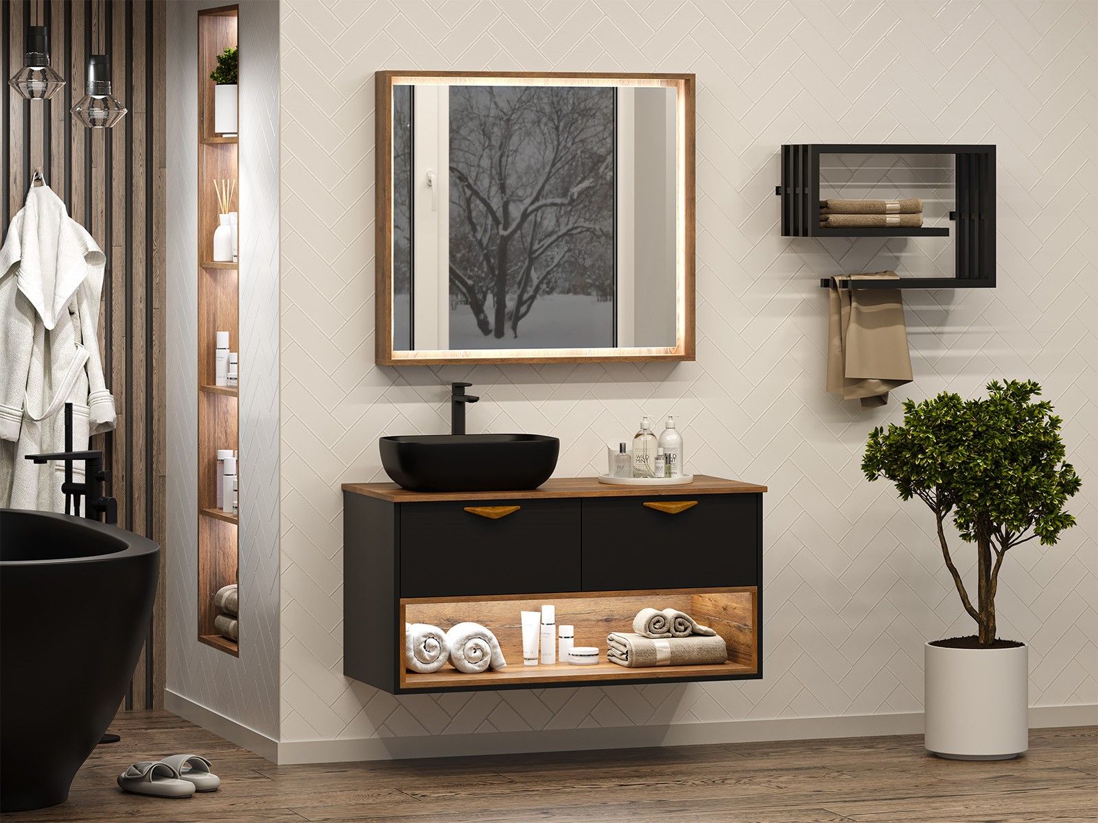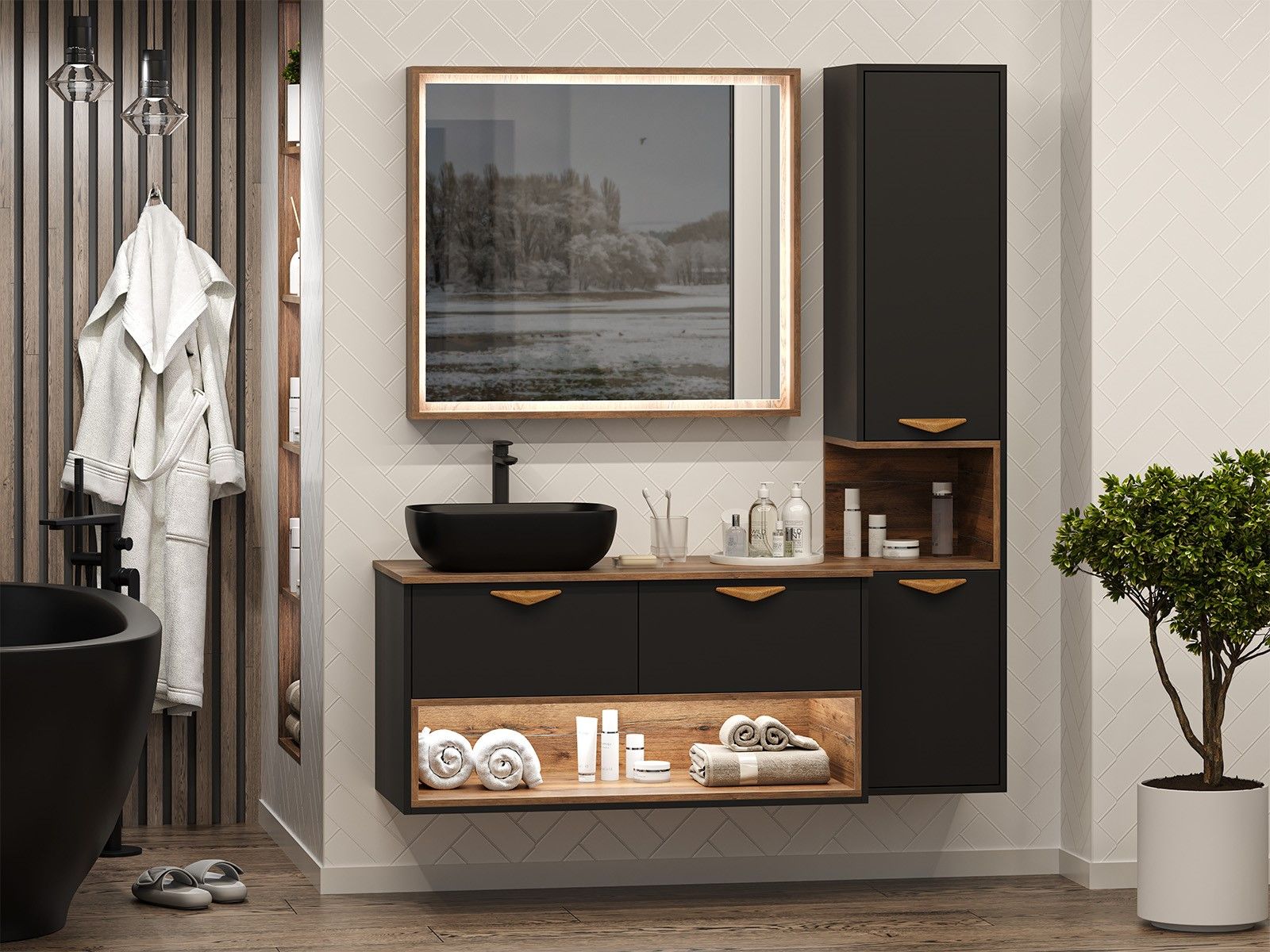 Подвесная тумба под раковину Brevita Bergen с подсветкой BER-07105-19-02-2Я 105см дуб Галифакс олово/чёрный купить
