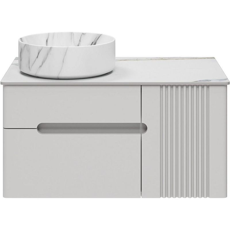 Тумба с раковиной Brevita Pallisandro 80 УТ000025399 подвесная. Pallisandro - когда эстетика встречается с функциональностью. Коллекция создана для ценителей утончённого дизайна и продуманных деталей. Здесь всё подчинено принципу элегантного минимализма: лаконичные фасады в эмали, изысканная фрезеровка на дверце и отсутствие внешней фурнитуры для чистоты линий. Главный акцент коллекции — столешницы из керамогранита, устойчивые к влаге, механическим повреждениям и химическим веществам. Накладные раковины гармонично завершают современный образ. Внутреннее пространство продумано до мелочей: ящики оснащены доводчиками скрытого монтажа, что обеспечивает плавное закрывание, а противоскользящие коврики внутри ящиков позволяют хранить вещи в идеальном порядке. Благодаря подвесному монтажу, мебель смотрится легко, а уборка становится удобнее. Pallisandro - это премиальный комфорт, который чувствуешь в каждой детали. Характеристики: Тумба под раковину: