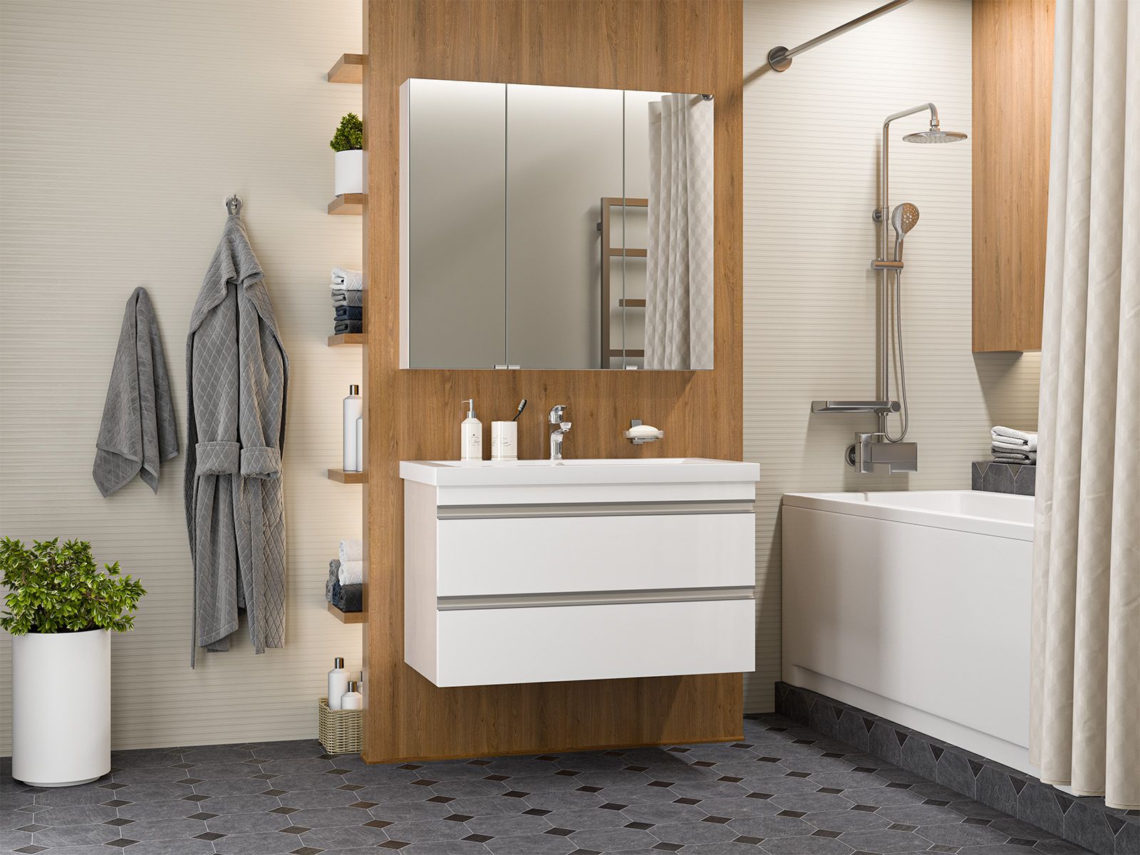 Подвесная тумба в ванную комнату – это не просто элемент мебели, а подлинный акцент в интерьере, который сочетает в себе функциональность и стиль. Она придаёт помещению лёгкость и воздушность, освобождая пространство на полу и создавая иллюзию большего объёма.Функциональные особенности таких тумб варьируются от наличия выдвижных ящиков до встроенных систем хранения, которые помогают организовать пространство ванной комнаты. Важным аспектом является также возможность выбора различных цветовых решений и отделок, что позволяет гармонично вписать тумбу в любой интерьер – от классического до ультрасовременного.С помощью подвесной тумбы ванная комната становится не только более удобной, но и эстетически привлекательной, создавая атмосферу уюта и роскоши.
