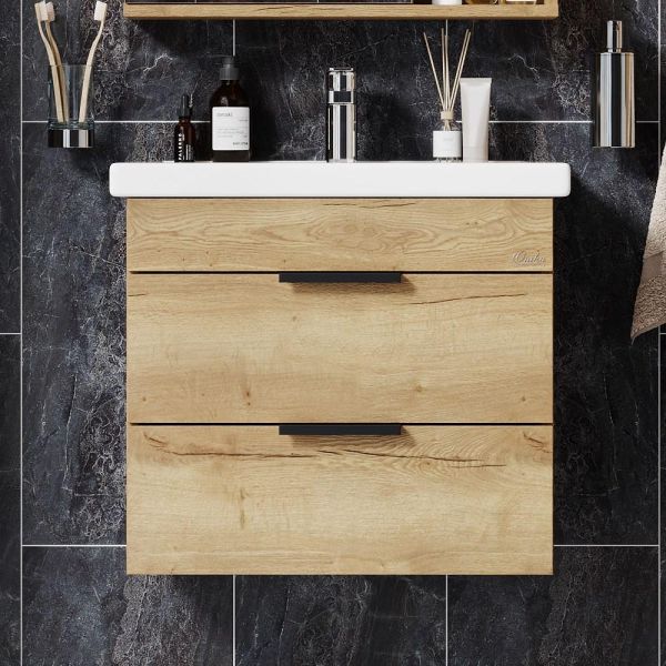 Подвесная тумба для ванной комнаты Onika Легран 60 - это сочетание насыщенного древесного декора и благородства металла: роскошная текстура и натуральный цвет дуба дают теплоту, а матовые металлические ручки добавляют урбанизма и солидности.