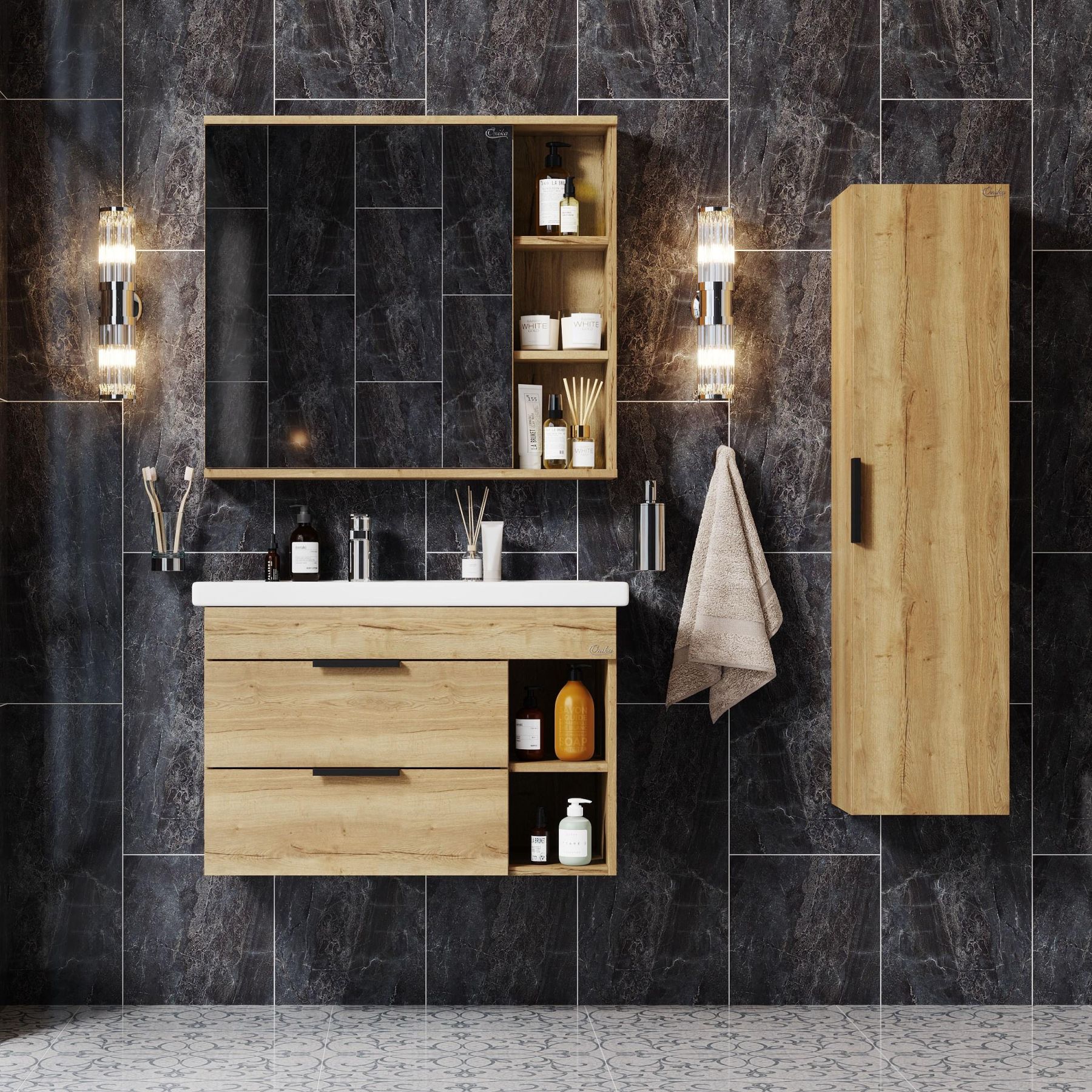 Подвесная тумба для ванной комнаты Onika Легран 80 - это сочетание насыщенного древесного декора и благородства металла: роскошная текстура и натуральный цвет дуба дают теплоту, а матовые металлические ручки добавляют урбанизма и солидности.