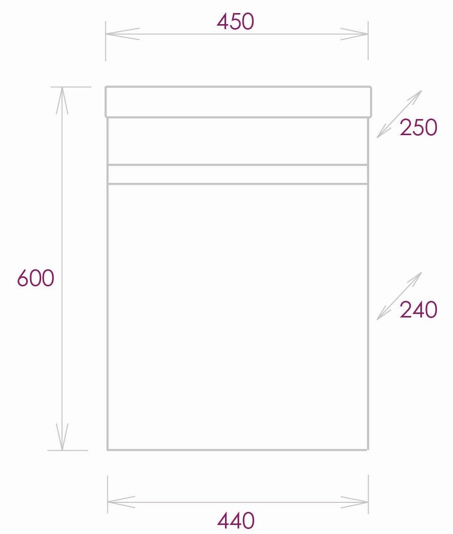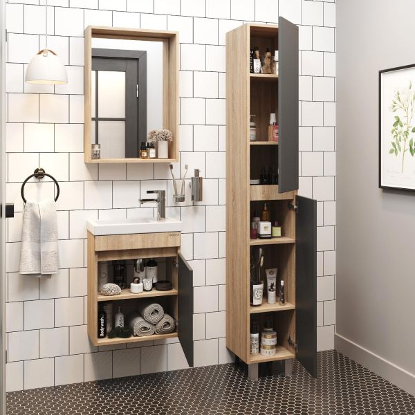 Тумба сочетает в себе красоту и функциональность: серый матовый фасад с покрытием SoftTouch, корпус цвета дуб сонома с роскошной текстурой, строгие формы без декора. За дверцей с интегрированной ручкой скрывается пространство с полкой для размещения необходимых бытовых принадлежностей.