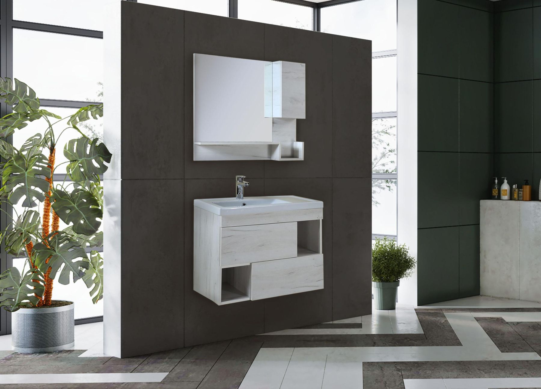 Подвесная тумба Onika Санторини 80 отражает актуальные тенденции в дизайне мебели для ванной комнаты: минимализм и геометрия фасадов, чёткость и лаконичность форм, отсутствие декора и стильный цвет белой древесины с текстурой дорогих пород.