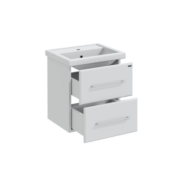 Тумба подвесная Омега 50 для умывальника Фостер 50. Корпус изделия выполнен из влагостойкого ЛДСП, фасад из МДФ и покрыт пленкой. Выдвижные ящики тумбы оснащены шариковыми направляющими полного выдвижения.