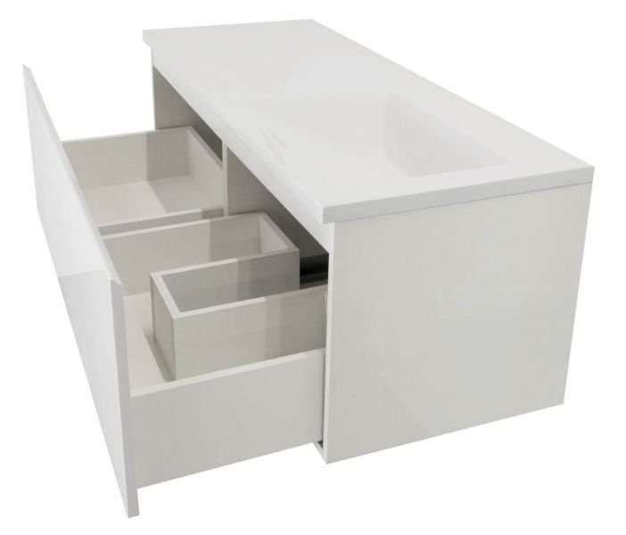 Отличительной особенностью коллекции Dallas Luxe является один большой функциональный ящик, который располагается по всей длине раковины. Ящик разделяется на две зоны, тем самым дает возможность хранения как крупных, так и мелких вещей. Стильная тумба впишется в любой современный интерьер и создаст комфорт в использовании. Подвесная система монтажа позволяет более эффективно использовать пространство, не мешает уборке в ванной комнате, не нарушает раскладку плитки на полу.