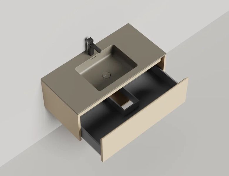 • Тумба и столешница из материала S-Stone в сборе (накладные раковины укомплектованы донным клапаном и поставляются в отдельной коробке)