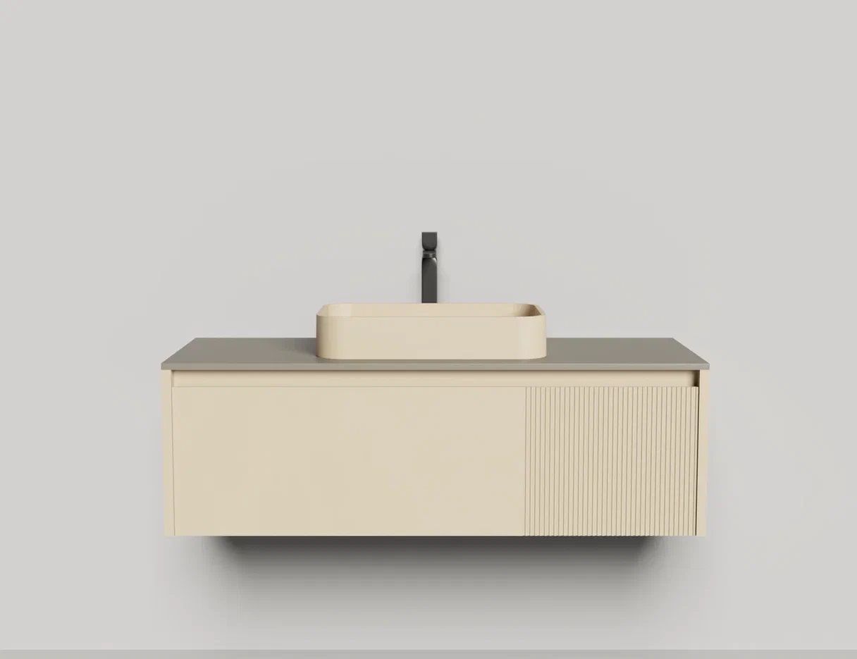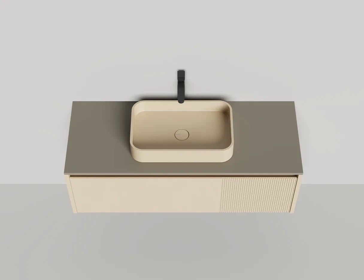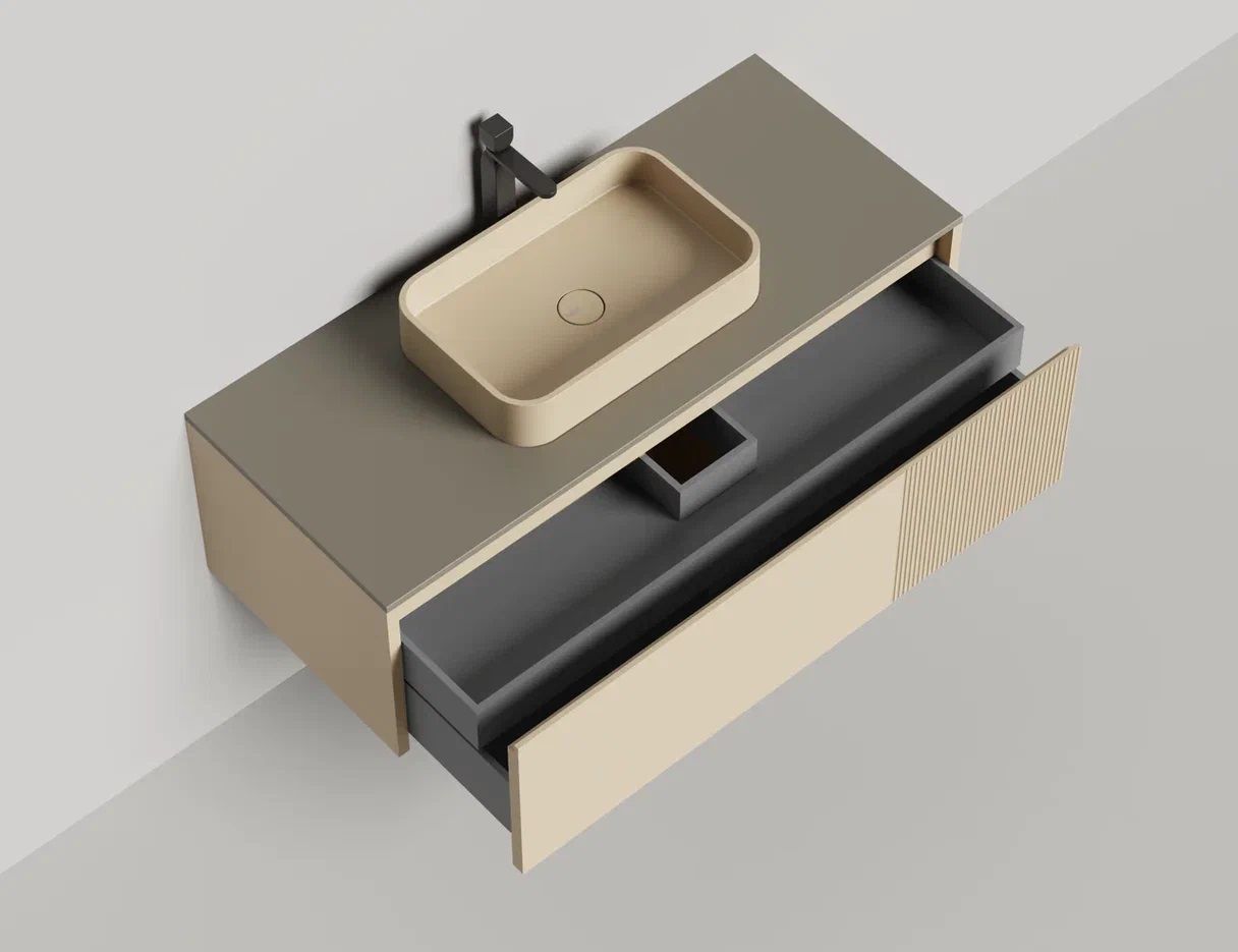 • Тумба и столешница из материала S-Stone в сборе (накладные раковины укомплектованы донным клапаном и поставляются в отдельной коробке)