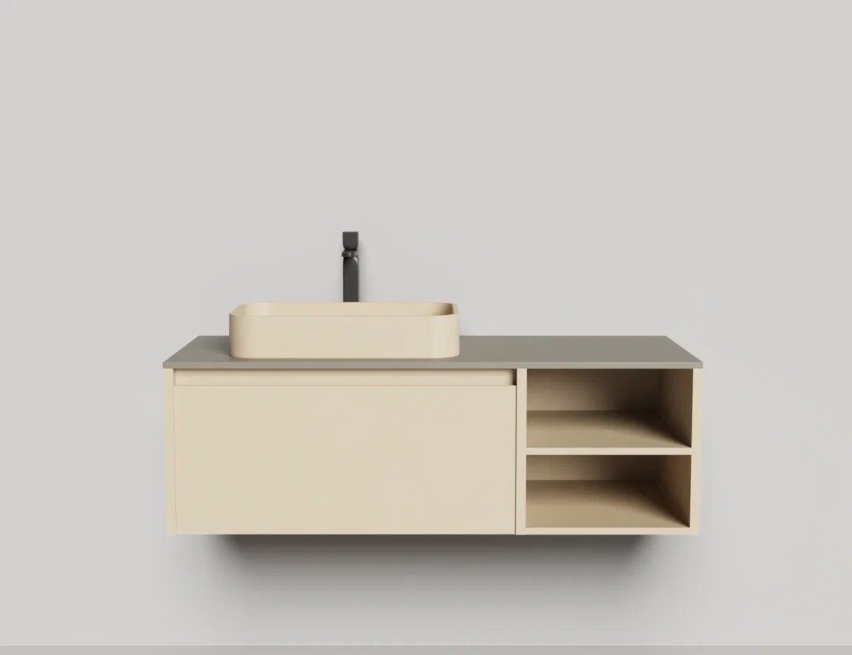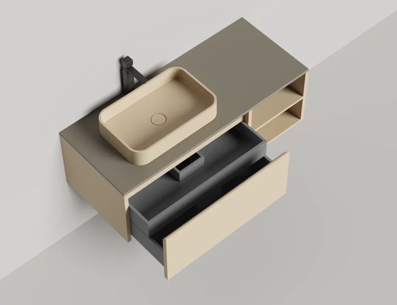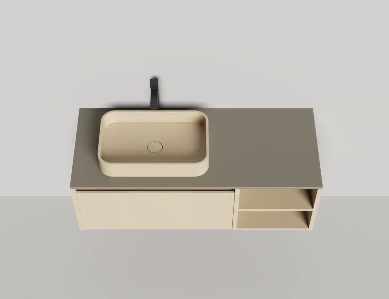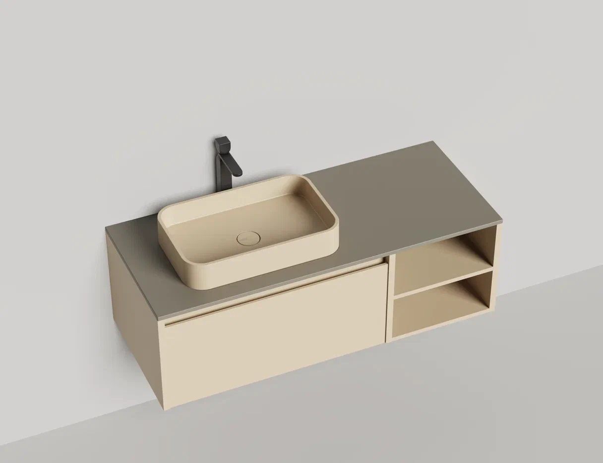 • Тумба и столешница из материала S-Stone в сборе (накладные раковины укомплектованы донным клапаном и поставляются в отдельной коробке)