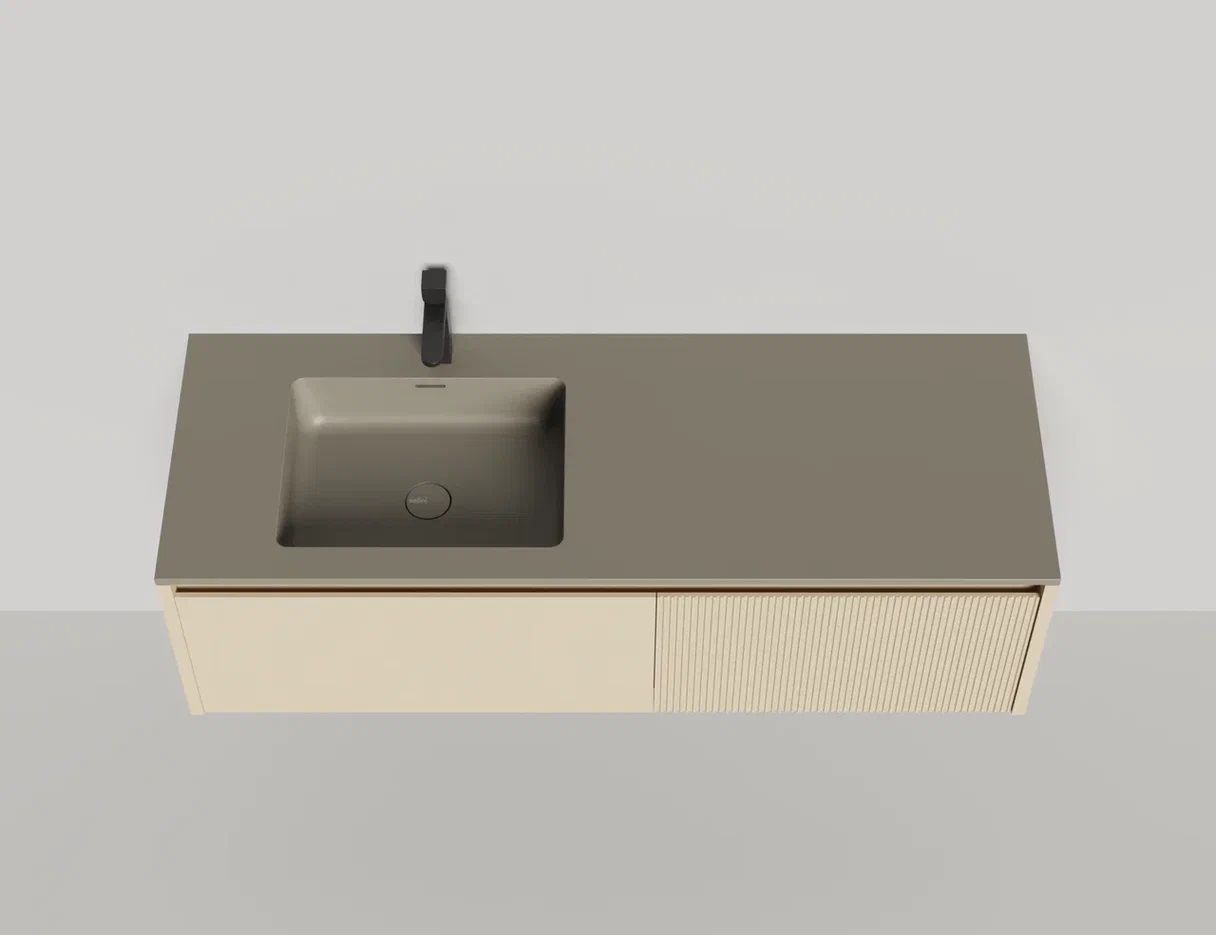 • Тумба и столешница из материала S-Stone в сборе (накладные раковины укомплектованы донным клапаном и поставляются в отдельной коробке)