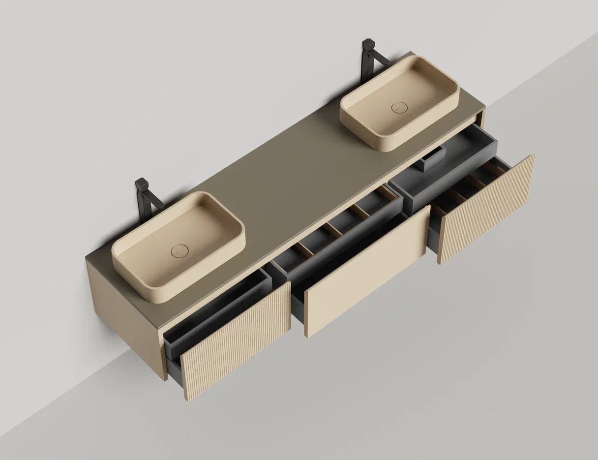 - Тумба и столешница из материала S-Stone в сборе (накладные раковины укомплектованы донным клапаном и поставляются в отдельной коробке)
