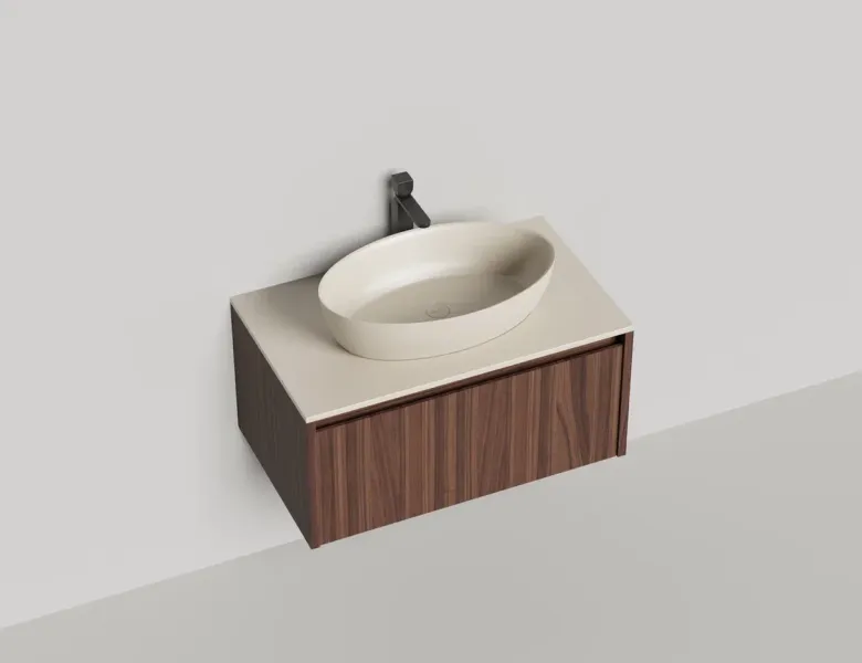 • Тумба и столешница из материала S-Stone в сборе (накладные раковины укомплектованы донным клапаном и поставляются в отдельной коробке)