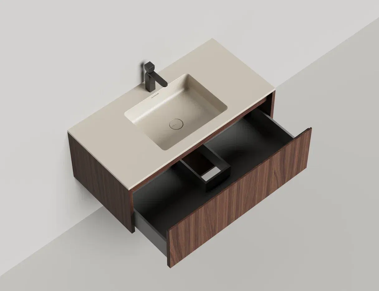 Подвесная тумба DOMINO предназначена для установки со встроенными или накладными раковинами Salini. Она отличается современным дизайном и привлекательным внешним видом. Гладкие и рельефные фасады ящиков в шпоне дерева или в матовом лаке позволяют подобрать комбинацию подходящего размера (ширина от 80 до 200 см) и наполнения.
