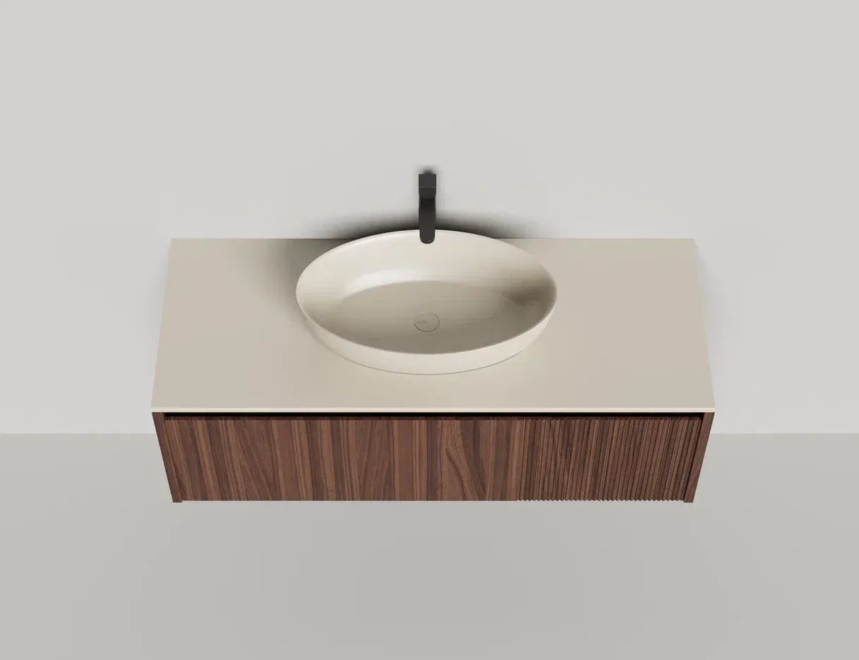 • Тумба и столешница из материала S-Stone в сборе (накладные раковины укомплектованы донным клапаном и поставляются в отдельной коробке)