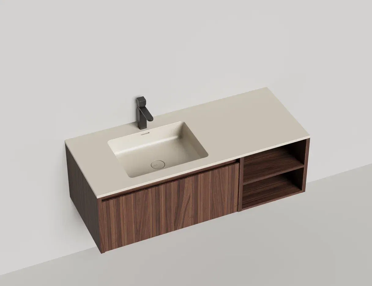 • Тумба и столешница из материала S-Stone в сборе (накладные раковины укомплектованы донным клапаном и поставляются в отдельной коробке)