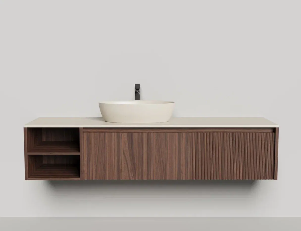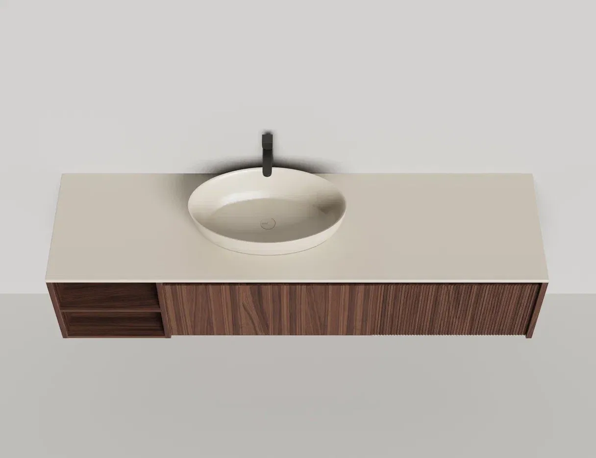 • Тумба и столешница из материала S-Stone в сборе (накладные раковины укомплектованы донным клапаном и поставляются в отдельной коробке)