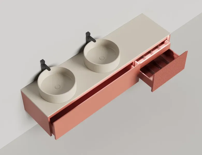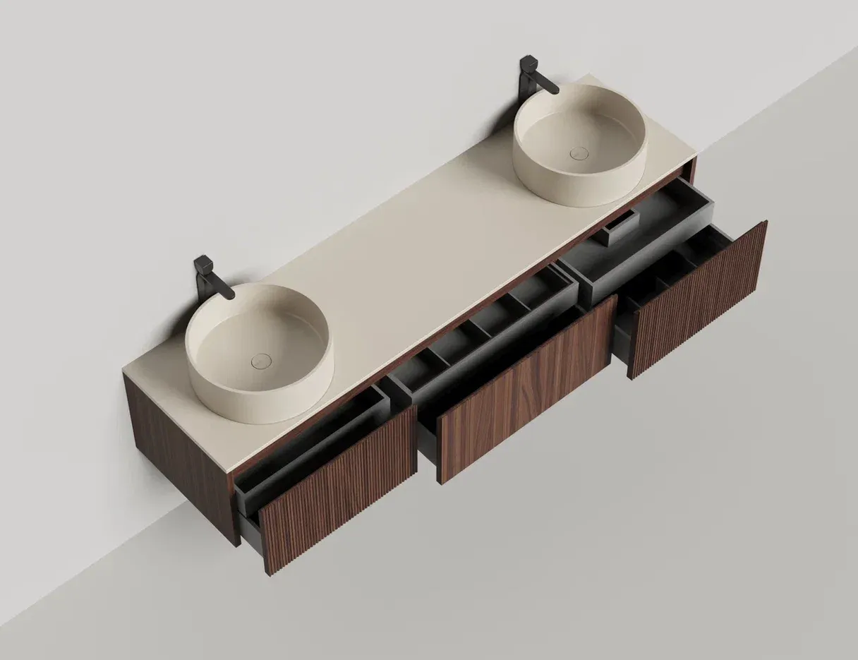 Подвесная тумба DOMINO предназначена для установки со встроенными или накладными раковинами Salini. Она отличается современным дизайном и привлекательным внешним видом. Гладкие и рельефные фасады ящиков в шпоне дерева или в матовом лаке позволяют подобрать комбинацию подходящего размера (ширина от 80 до 200 см) и наполнения.