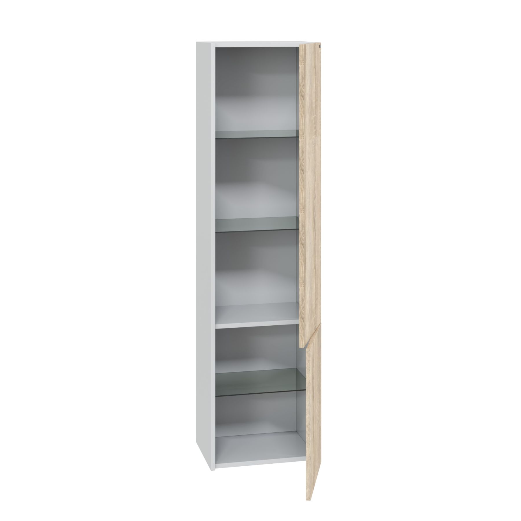 Шкаф-пенал подвесной Меркурий 40. Фасады пенала выполнены из ЛДСП с ламинацией, боковины покрыты матовой белой эмалью.  На дверках петли с плавным закрыванием, полочки выполнены из стекла.