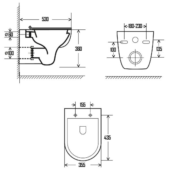 • Прилегание унитаза к стене: