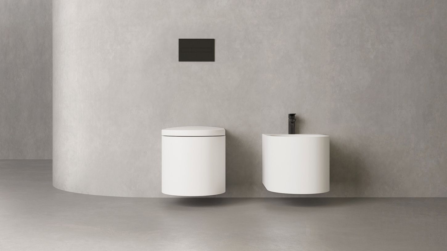 Унитаз GEMELLI — это комбинация безободковой керамической основы белого цвета (VitrA) и внешнего корпуса, изготавливаемого из материала S-Stone, который может быть окрашен по палитре RAL Classic.