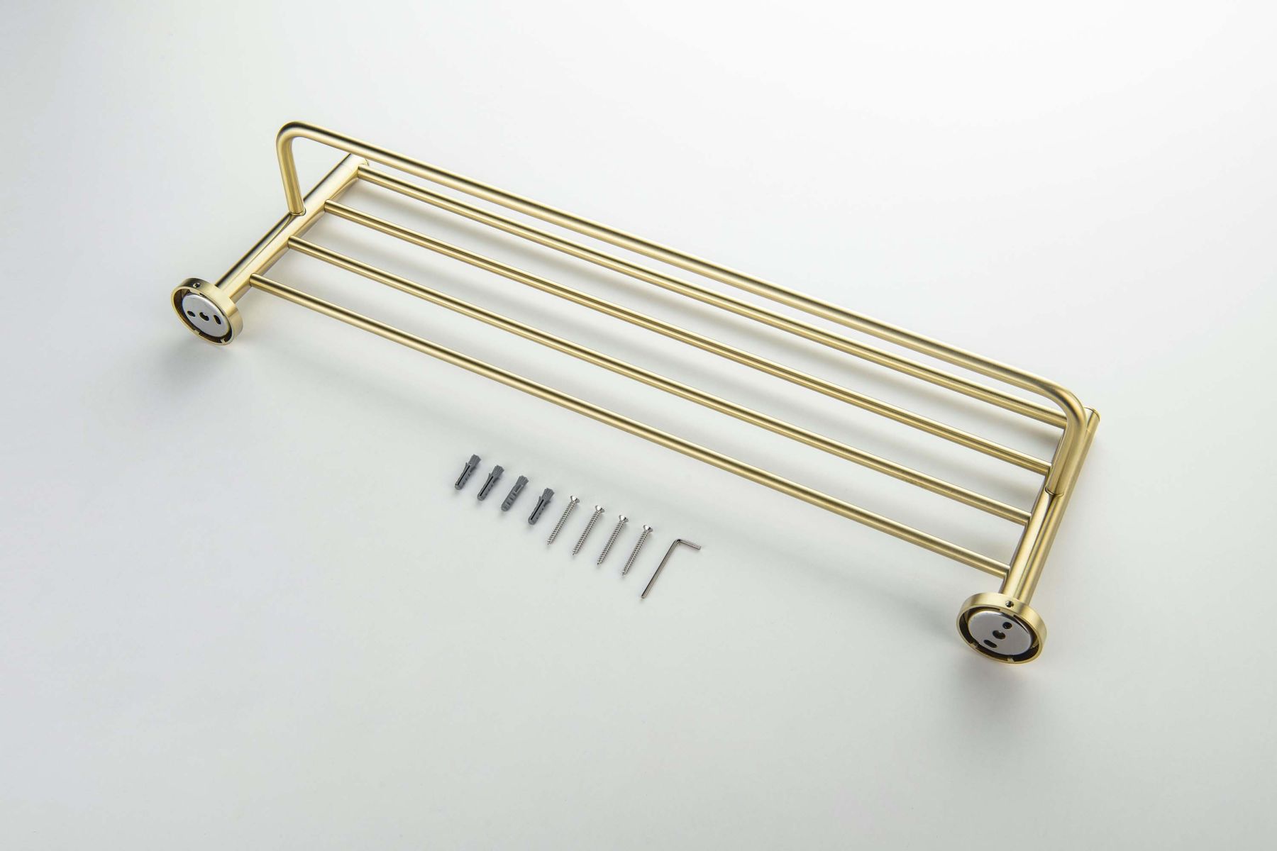 Общий размер (мм): 654*204*130Основной материал: латунь, нержавеющая стальКоличество полок: 2Метод крепления: шурупыМонтаж: на стенуНазначение: аксессуарыТип продукта: полка для полотенецГарантия (лет): 5Легкая установка
