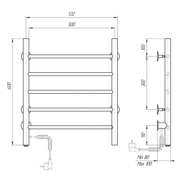 М/о расстояние (межосевое расстояние): 500Количество перекладин: 5Коллекция: АврораТип: электрическиеЦвет: черныйМощность, Вт: 52Ширина (мм): 532Высота (мм): 600Глубина (мм): 80-100Вес: 3,64Объем: 0,0385Тэн/подключение: слеваСтрана: РоссияГарантия: 2 года