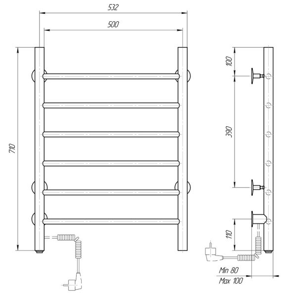 М/о расстояние (межосевое расстояние): 500Количество перекладин: 6Коллекция: АврораТип: электрическиеЦвет: черныйМощность, Вт: 70Ширина (мм): 532Высота (мм): 710Глубина (мм): 80-100Вес: 3,9Объем: 0,0418Тэн/подключение: слеваСтрана: РоссияГарантия: 2 года