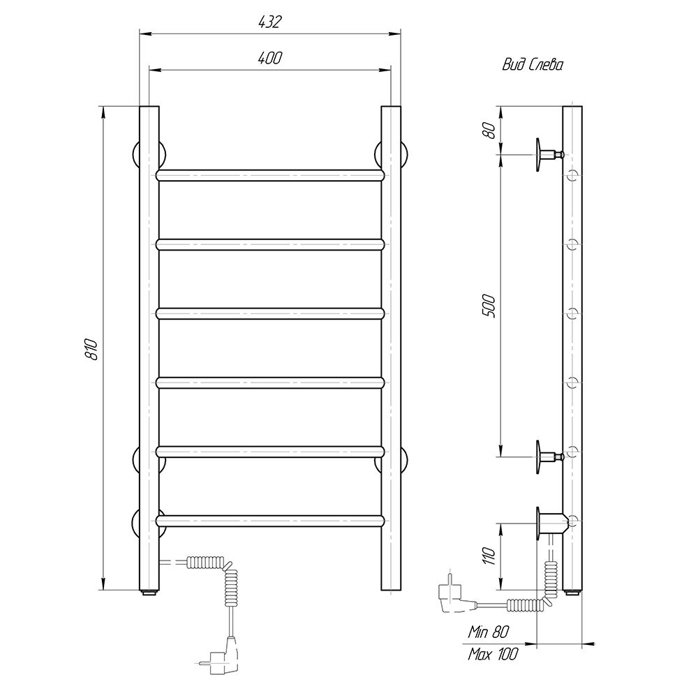 М/о расстояние (межосевое расстояние): 400Количество перекладин: 6Коллекция: КлассикТип: электрическиеЦвет: черныйМощность, Вт: 53Ширина (мм): 432Высота (мм): 810Глубина (мм): 80-100Вес: 4,47Объем: 0,0675Тэн/подключение: слеваСтрана: РоссияГарантия: 2 года