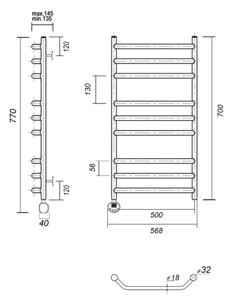 М/о расстояние (межосевое расстояние): 500Количество перекладин: 9Коллекция: ЛаураТип: электрическиеЦвет: золотоМощность, Вт: 300Ширина (мм): 532Высота (мм): 700Глубина (мм): 145-135Вес: 7,7Объем: 0,061875Тэн/подключение: подключение слеваСтрана: РоссияГарантия: 2 года