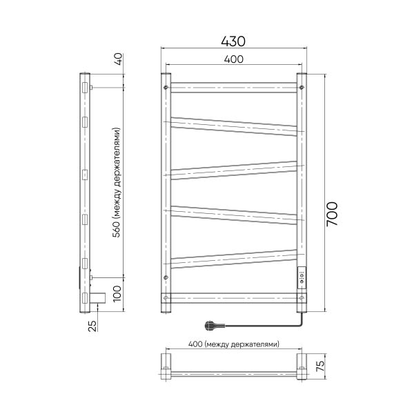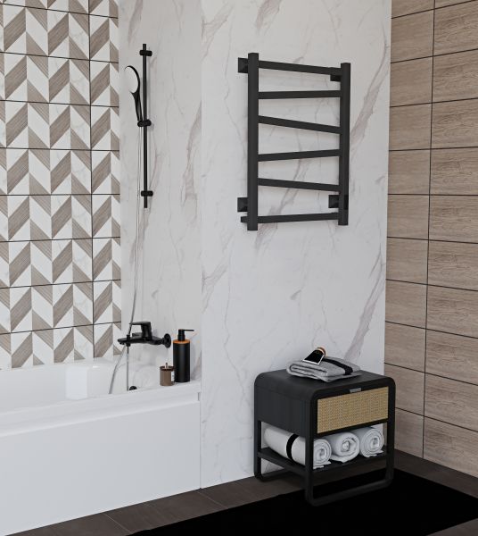 Полотенцесушитель чёрный матовый окрашен безопасной порошковой краской по специальной технологии для придания дополнительной стойкости к повреждениям и устойчивости к воздействию воды и пара. Плюс данной окраски также в том, что на покрытии не остаются отпечатки и разводы, а значит чистота и аккуратный вид сохранится дольше. Благодаря строгим формам электрополотенцесушитель прекрасно впишется в интерьер душевой комнаты или ванной. Особенностью данной модели являются перекладины, расположенные под наклоном.