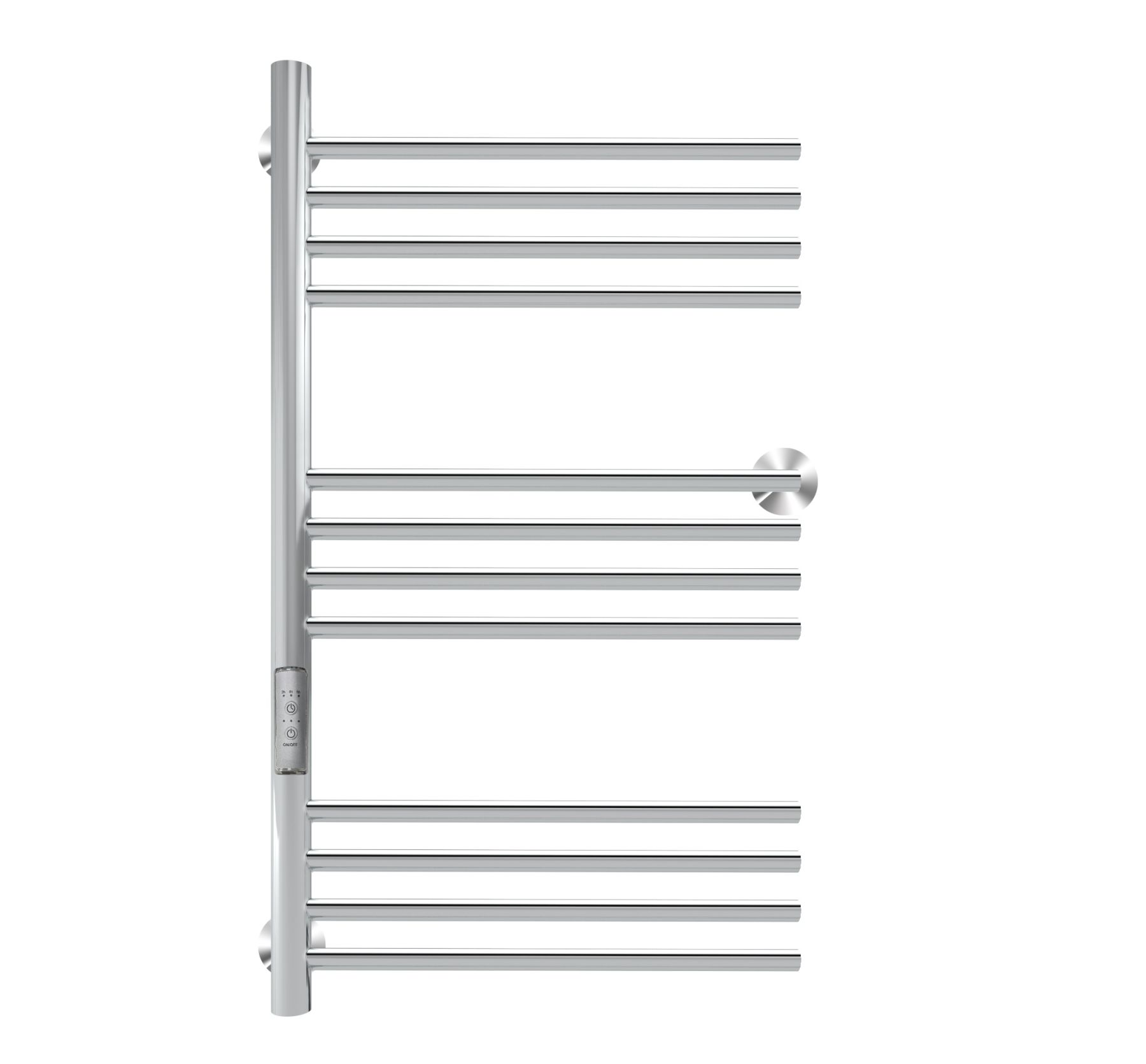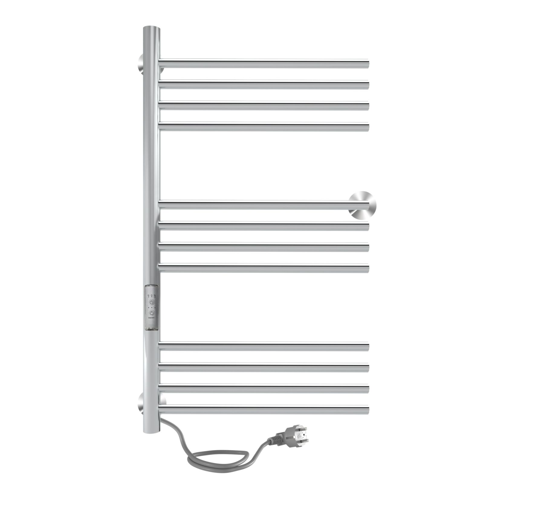 Полотенцесушитель электрический INDIGO Family хром. Полотенцесушитель с одной стойкой, имеет 3 держателя для надежной фиксации на стене. Хромированное изделие с блестящей поверхностью, которое достигается путем электрохимической полировки. Перекладины удобны для размещения большого количества текстильных вещей на просушивание, подходит для большой семьи. С помощью терморегулятора можно регулировать температуру в диапазоне от 40 до 50 градусов (с шагом 5 градусов) — уровень температуры показывается количеством горящих светодиодов. Таймер можно настроить на отключение через 2, 4, 6 часов. Возможно скрытое подключение, а также прямое подключение в розетку, шнур расположен слева изделия, длина 1,1 м. В комплектацию входят: 3 телескопических держателя, комплект монтажа (дюбели и саморезы), инструкция с гарантийным талоном на 3 года. Срок службы изделия не ограничен.