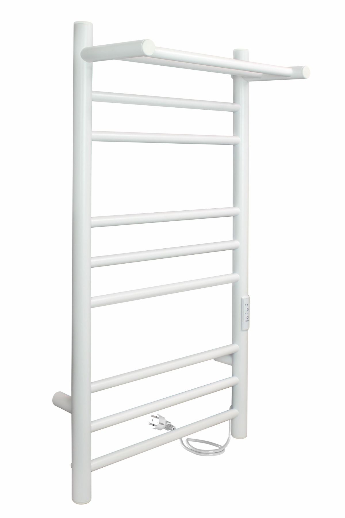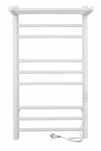 Полотенцесушитель с терморегулятором и полкой в белом матовом цвете. Изделие имеет 8 перекладин, это удобно для размещения большого количества текстильных изделий.  Полотенцесушитель с полкой удобен для дополнительного хранения полотенец, халатов.
