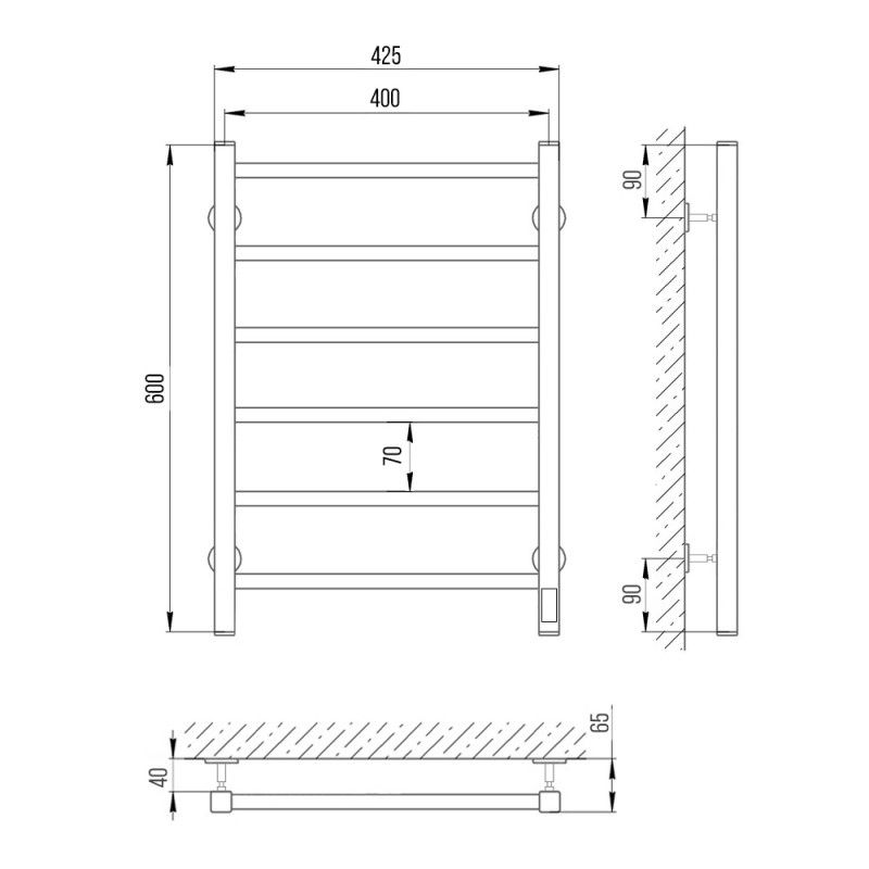 Модель: Феличия ЧККод товара: 73207588Материал: сталь чернаяПокрытие: краска порошковая белая RAL 9016 (белый матовый муар)Диаметры и толщина: стойка ? 30х30, толщина 1,5 мм; перемычка Ø20, толщина 1,5 ммРегулятор: на стойке (программируемый регулятор)Терморегулятор: даТаймер: даВозможность скрытого монтажа: да (в комплекте)Размещение шнура: справа (Также есть исполнение с левым подключением)Температура поверхности изделия*: 50±5°CНапряжение питания: 220 ВВес: 3,7 кгКомплектация: